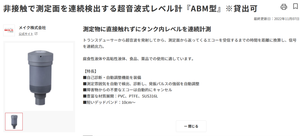 非接触で測定面を連続検知する超音波式レベル計『ABM型』