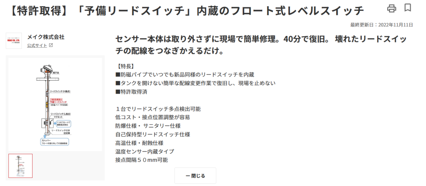 「予備リードスイッチ」内蔵のフロート式レベルスイッチ【特許取得済】