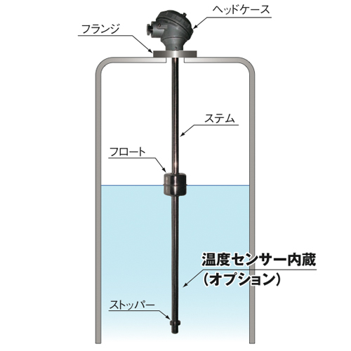 フロート(浮き子)が上下することにより、フロート内部のマグネットがステム内部のリードスイッチを作動させて液面を検出する。
